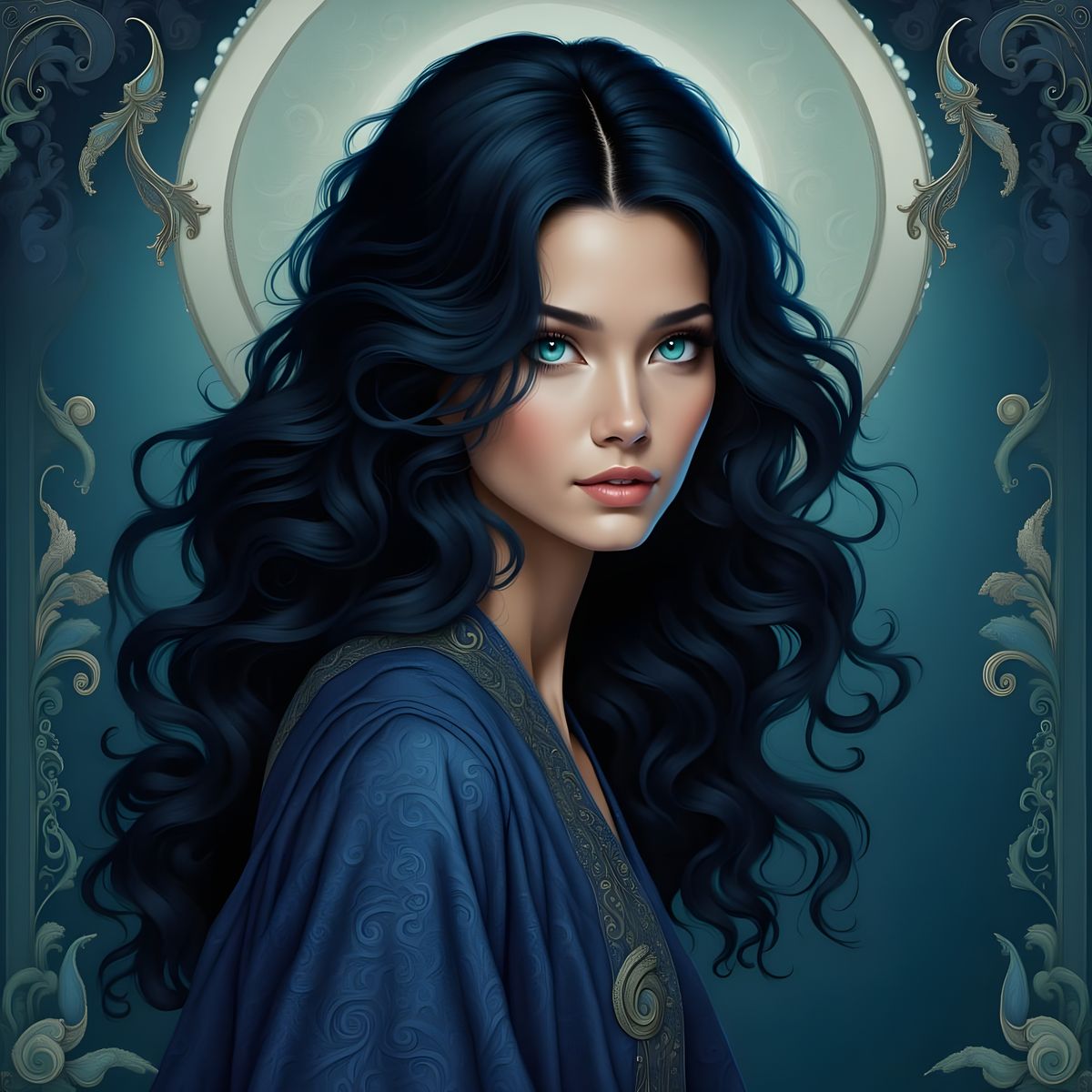 This image shows a stunning Norse goddess with silky black hair, gazing over her shoulder in a beautiful paisley robe, bathed in soft moonlight
