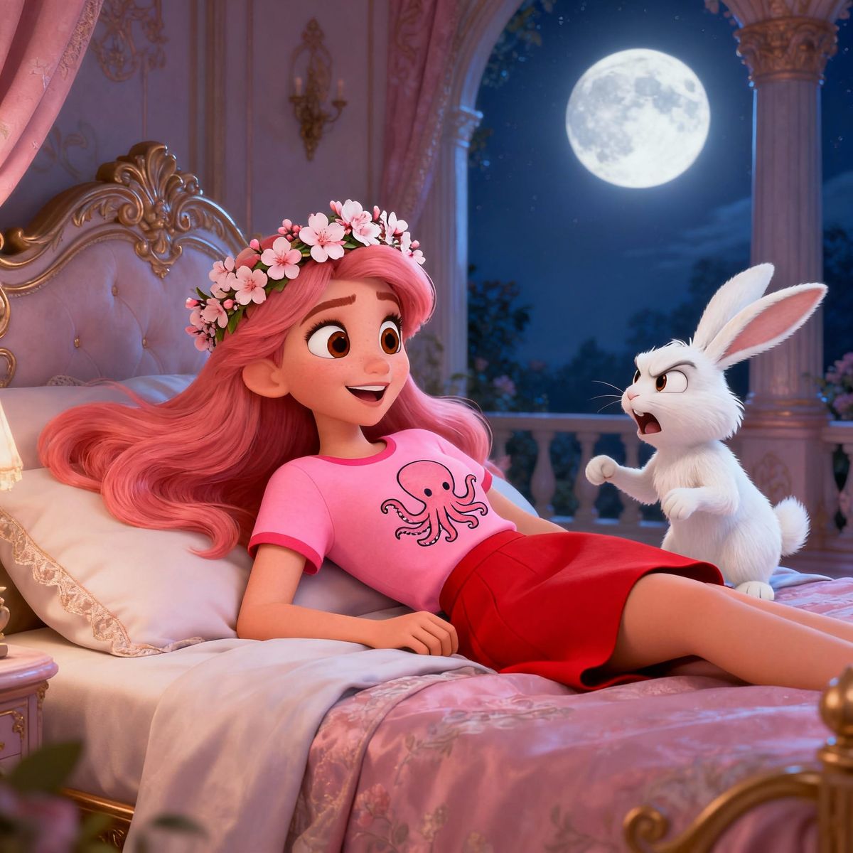 A 3D render of a cheerful pink-haired princess with a rabbit companion in a grand bedroom, inspired by classic Disney animation. Moonlit night visible outside.