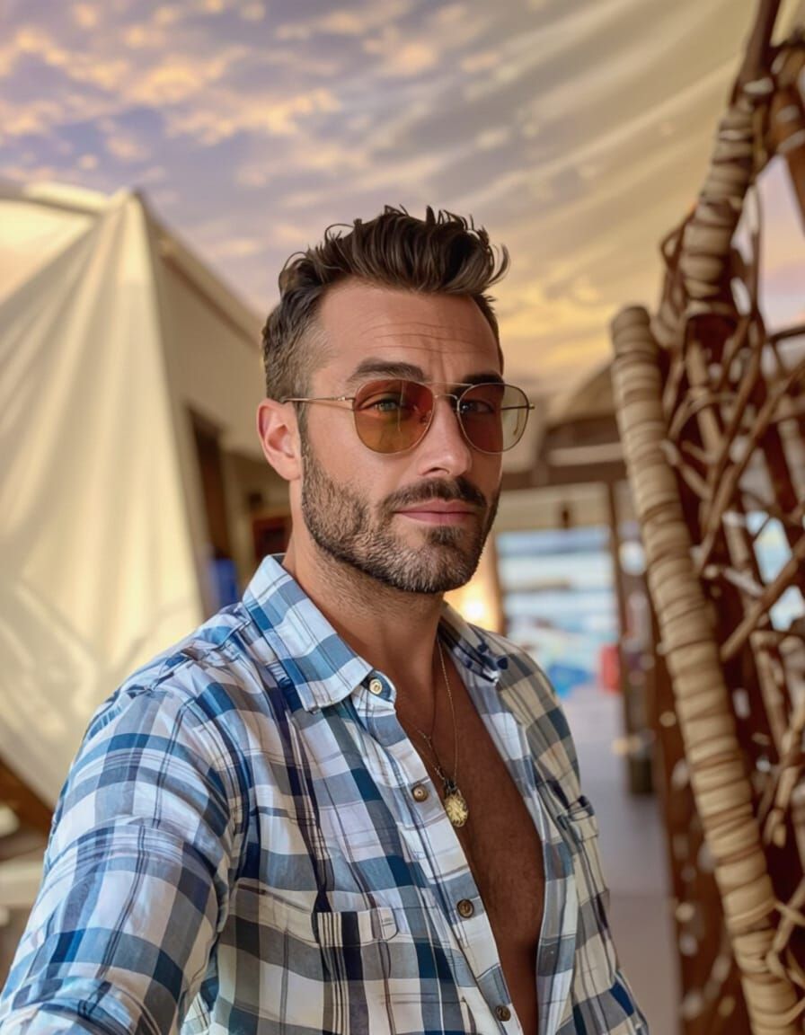 A hyperrealistic photograph of a person at sunset on a beach. The image features warm, golden and orange colors, with a focus on textures and intricate details in a casual summer outfit.