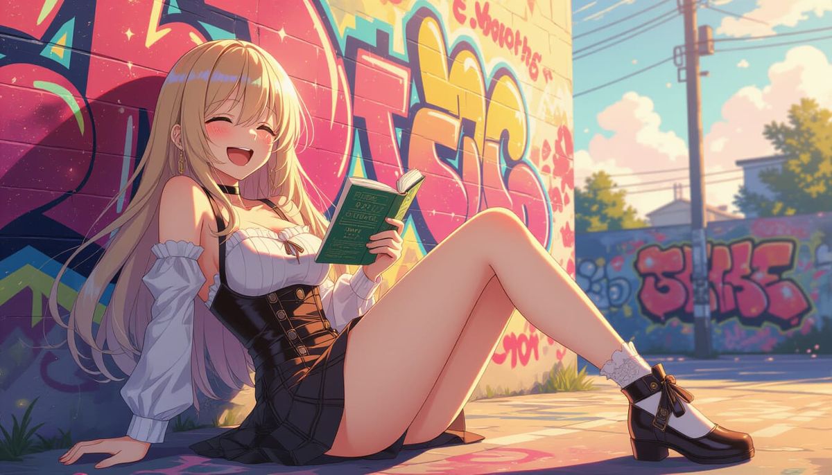 A vibrant image of a blonde, anime-style bookworm in a retro outfit, laughing amidst colorful graffiti and glitter. The photorealistic style captures a golden hour scene with bright, detailed visuals.