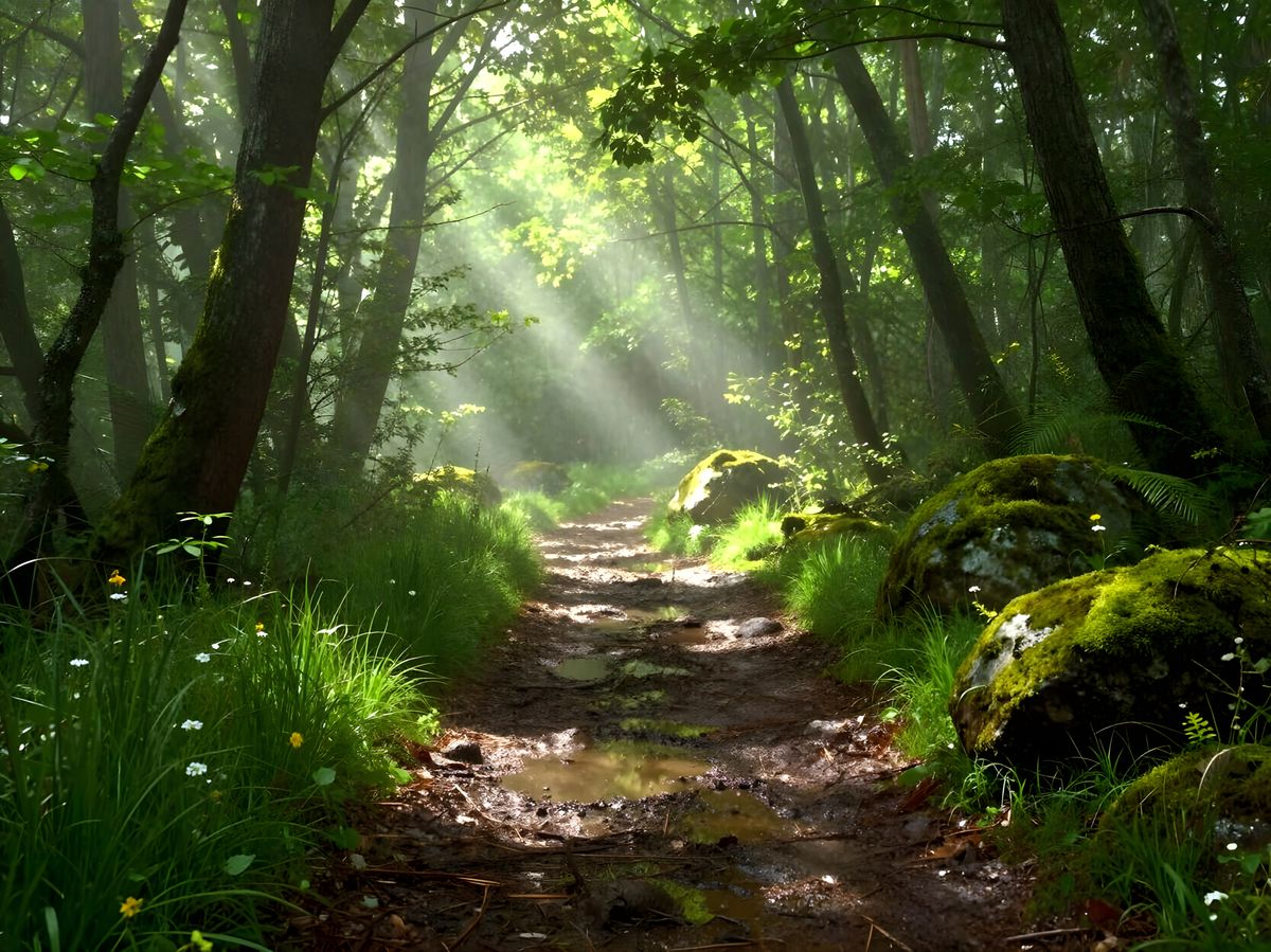 This image depicts a serene, sunlit forest path after a gentle rain. Sunlight filters through trees, highlighting mist rising from damp earth and moss. Realistic concept art style.