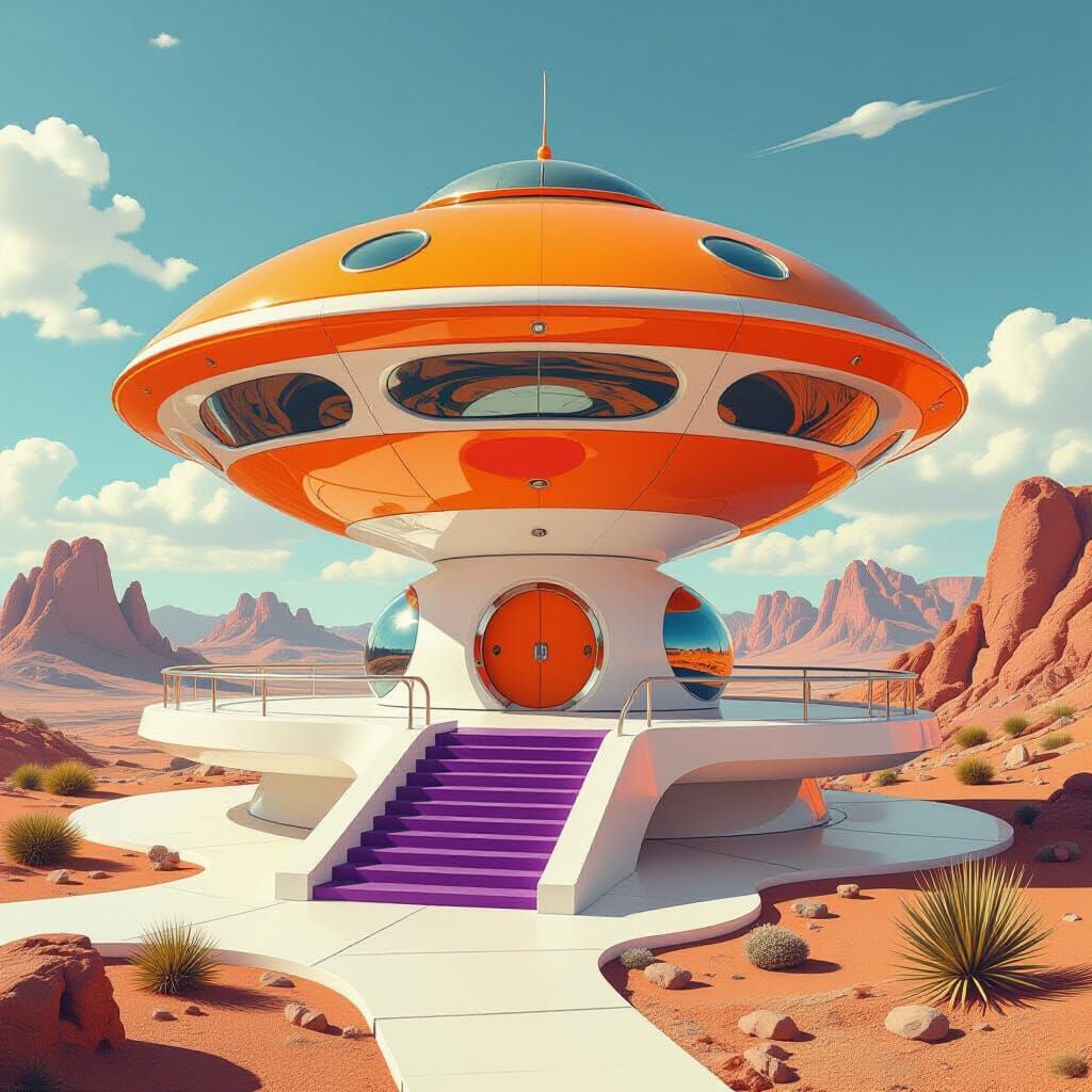 This image depicts a 1960s-inspired creative studio featuring an orange UFO-shaped dome with portholes, elevated above white structures in a desert setting. It has a dreamy, nostalgic aesthetic.