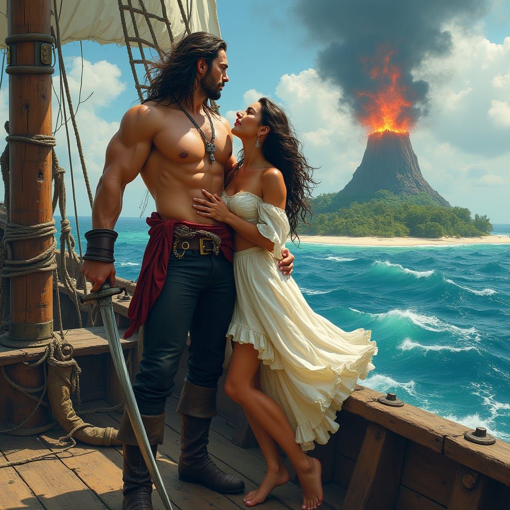 This image shows a confident pirate standing on a weathered ship, gazing out at the turbulent seas. He's surrounded by a stunning woman and a tropical island with a majestic volcano, inspired by the dynamic styles of Frazetta and Beksiński.