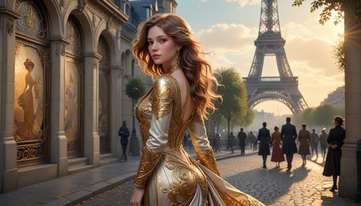 A stunning portrait of a French Victorian woman in the style of Art Nouveau, set against the iconic Eiffel Tower in Paris, with intricate details and elegant lines