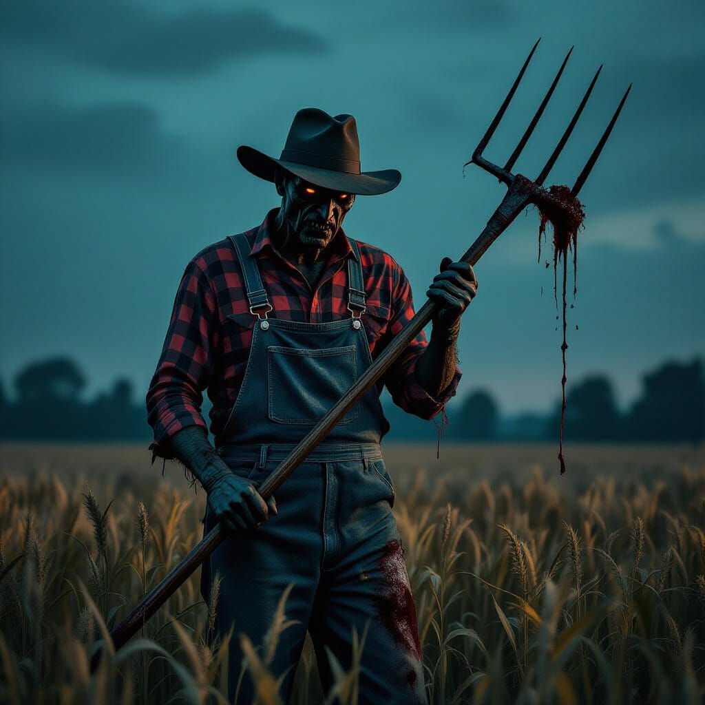 This image depicts a menacing farmer in a dark field at night, clutching a bloodied pitchfork. The style is dark and atmospheric, with dramatic shadows and muted colors.