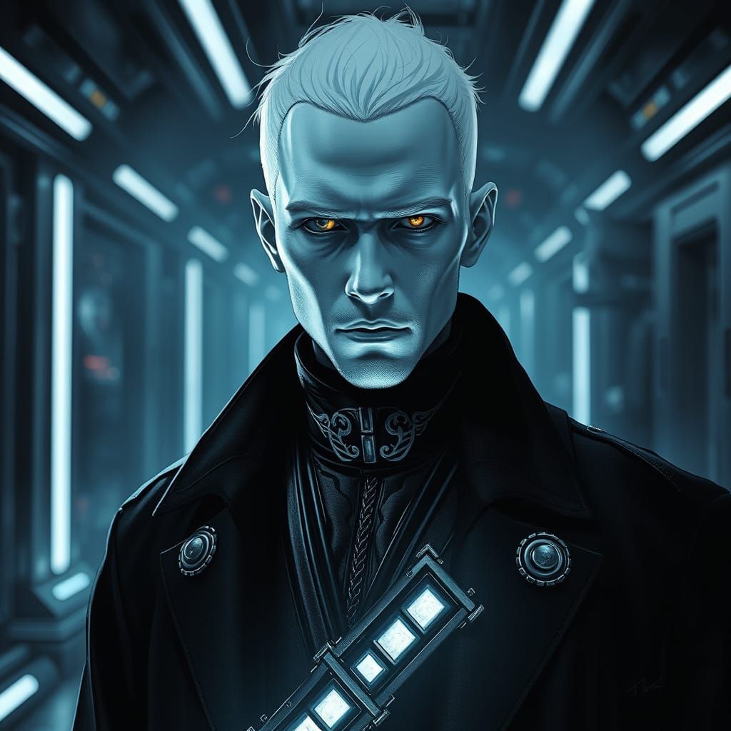 A close-up of a mysterious soldier in a dimly lit, futuristic interior, illuminated by eerie neon light and deep shadows, blending traditional and digital art styles in a unique, atmospheric scene.