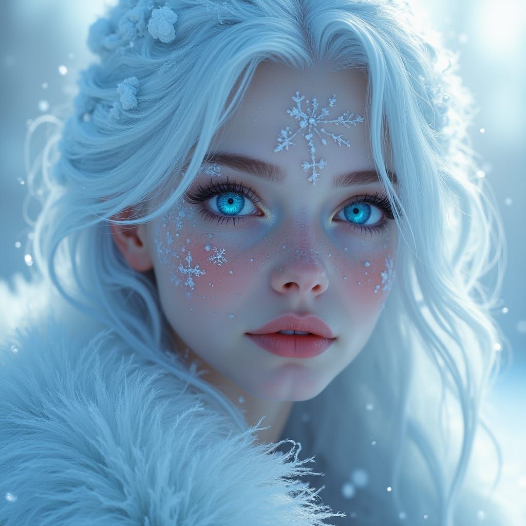 This image shows a stunning snow queen with ice tattoos and flowing white hair. Her piercing blue eyes glow with ethereal light, capturing the majesty of winter in a hyperrealistic digital art style.