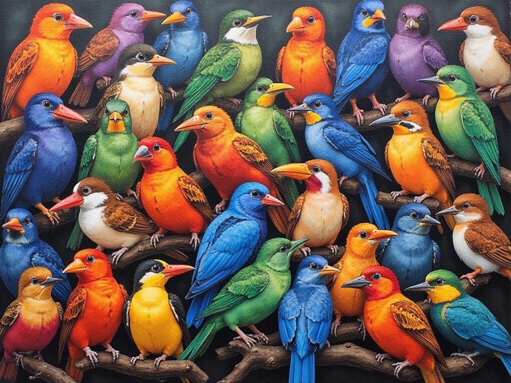 This image is a kaleidoscopic celebration of birds from around the world, set against a backdrop of vibrant colors and textured brushstrokes, blending elements of neo-impressionism and expressionism in a stunning digital painting.
