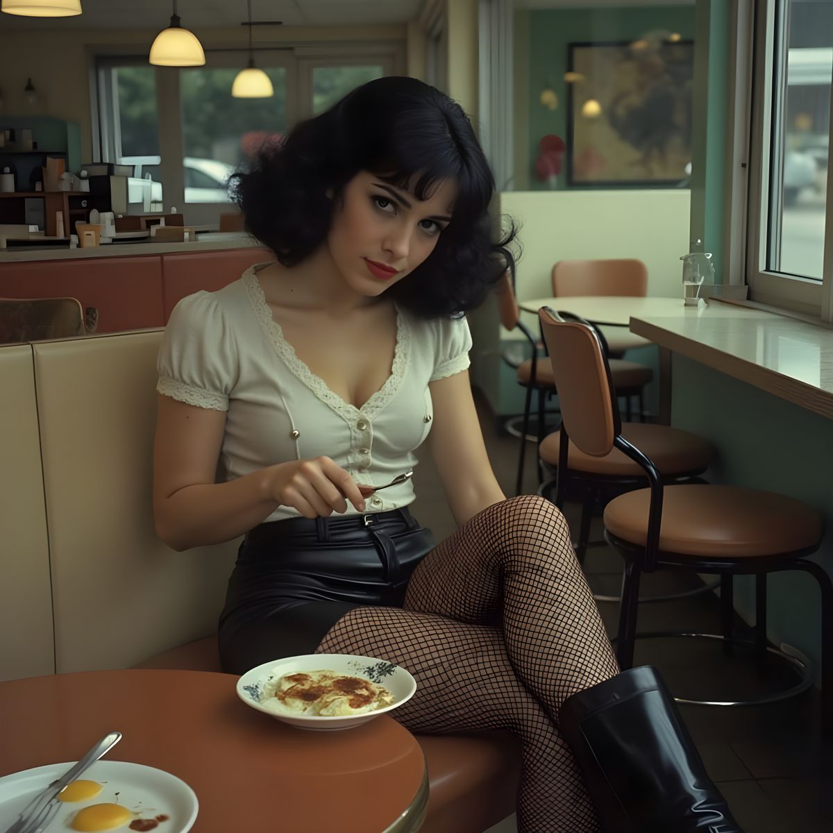 This image shows a gothic housewife in a diner during a rainstorm, captured in the style of a vintage RPPC postcard. The scene evokes a moody, noir atmosphere.