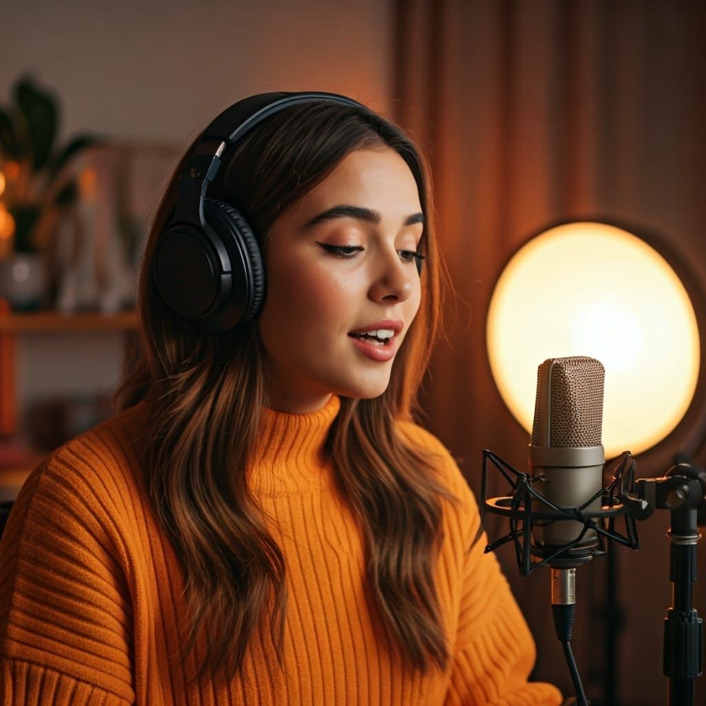 A vibrant image of a Gen Alpha YouTuber singing in her home studio. The scene is brightly lit and decorated, capturing a colorful, trendy aesthetic.