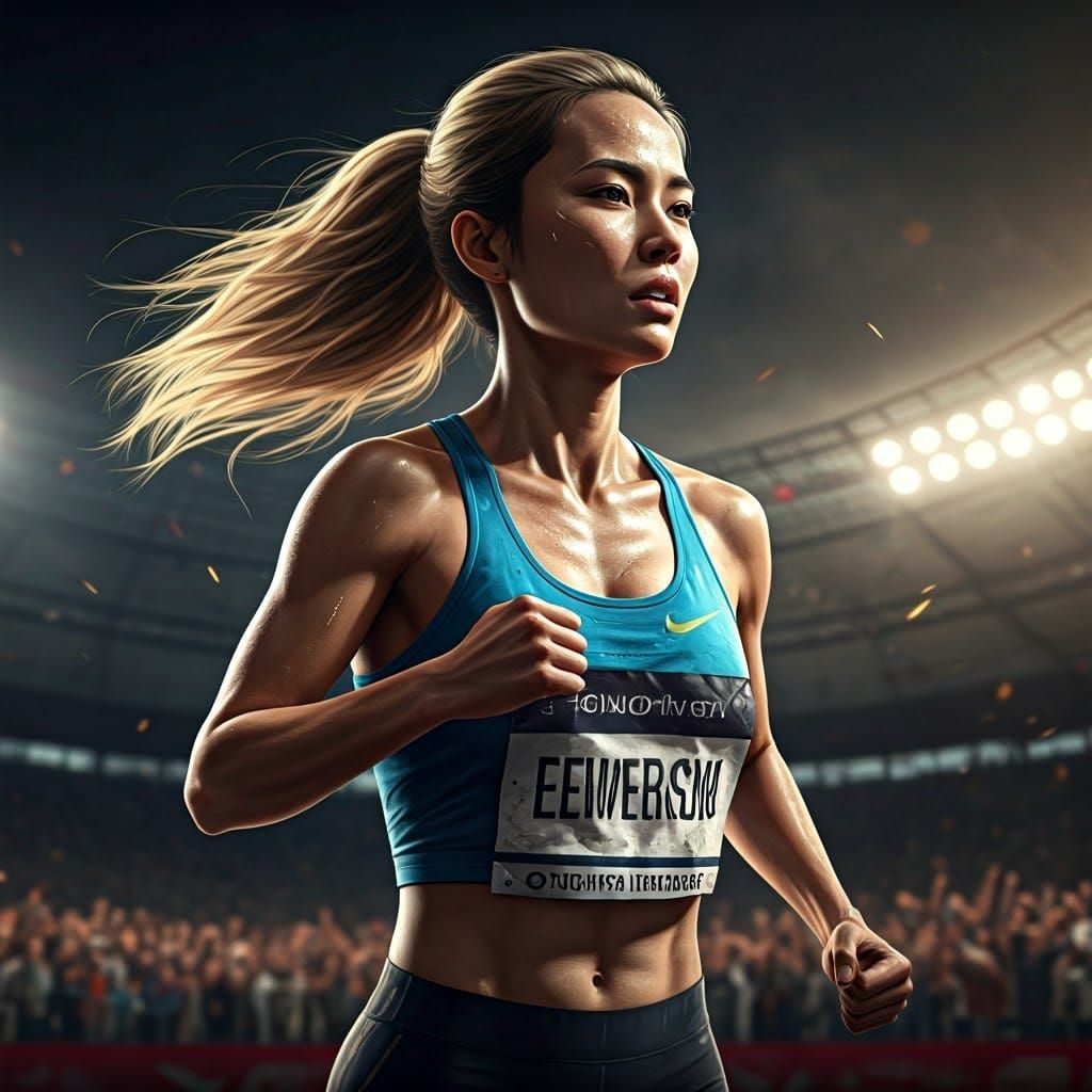 This photorealistic image captures the intense moment of a determined woman nearing the finish line of a marathon, surrounded by a blur of cheering crowds and vibrant stadium lights, with intricate details and textures reminiscent of cinematic action shots.