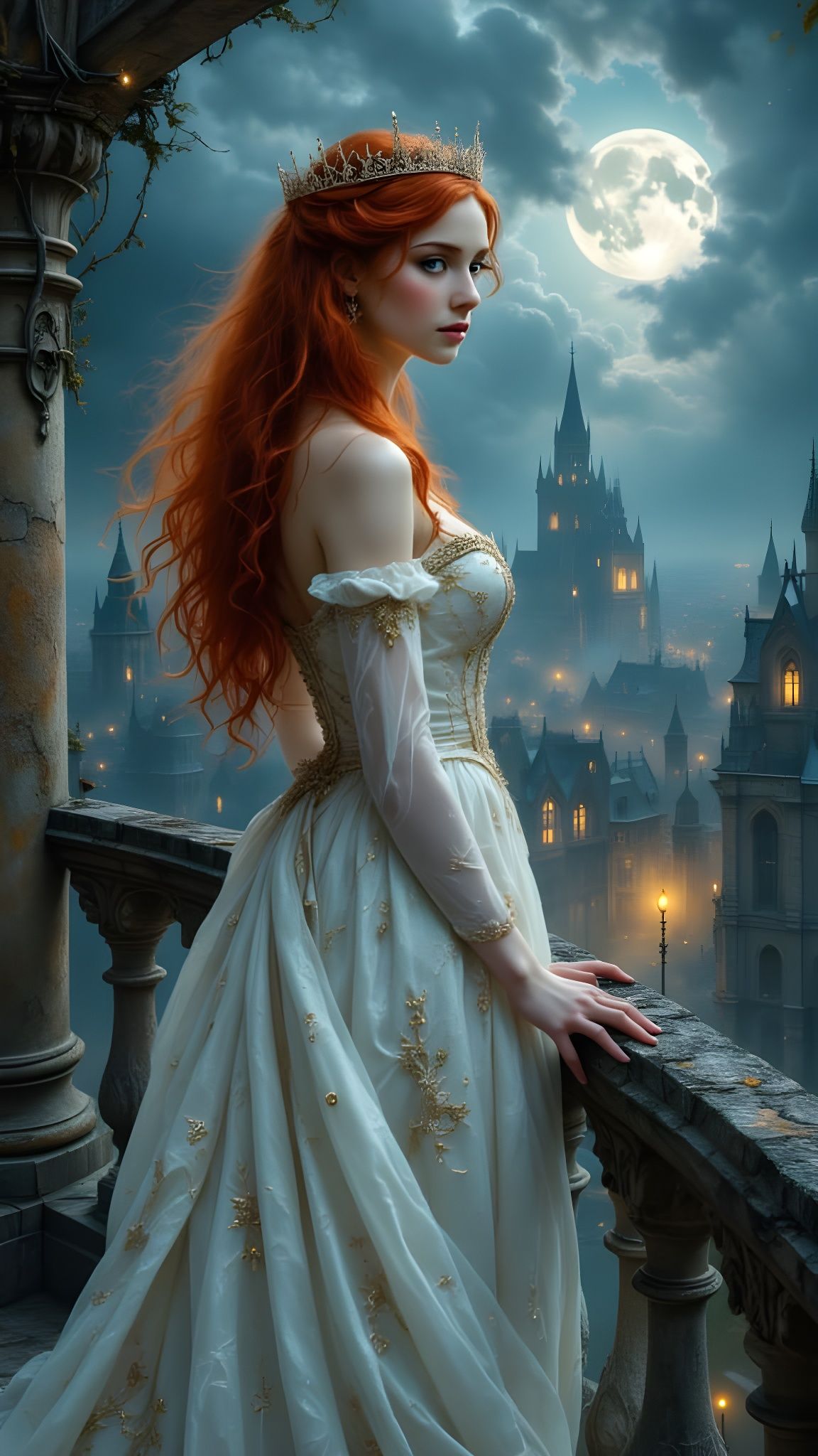 A striking picture of a princess on a gothic balcony. She has flowing red hair and a white gown, with magic curling around her fingers as she gazes at a distant storm in a dark fairytale illustration style.