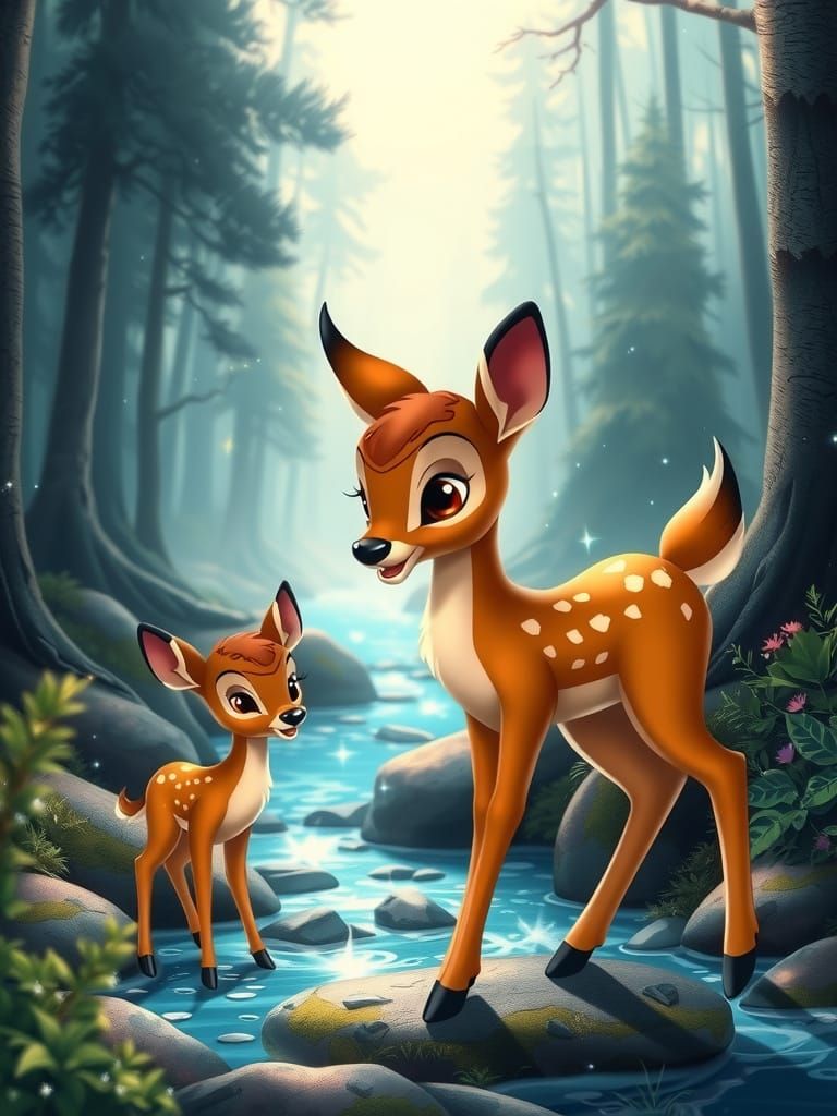 This image shows a charming scene of a young deer and his mother standing together in a mystical forest, surrounded by a sparkling stream and subtle touches of diamond-like glitter.