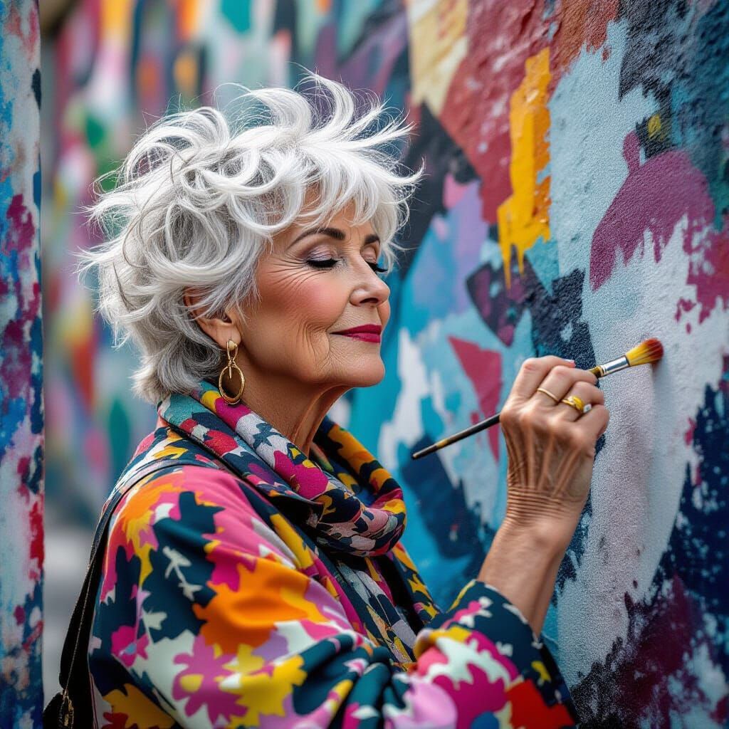 This image shows an older woman with white hair creating vibrant landscapes with expressive brushstrokes. The digital art blends screen print and pop art elements in a geometric, symmetrical composition.