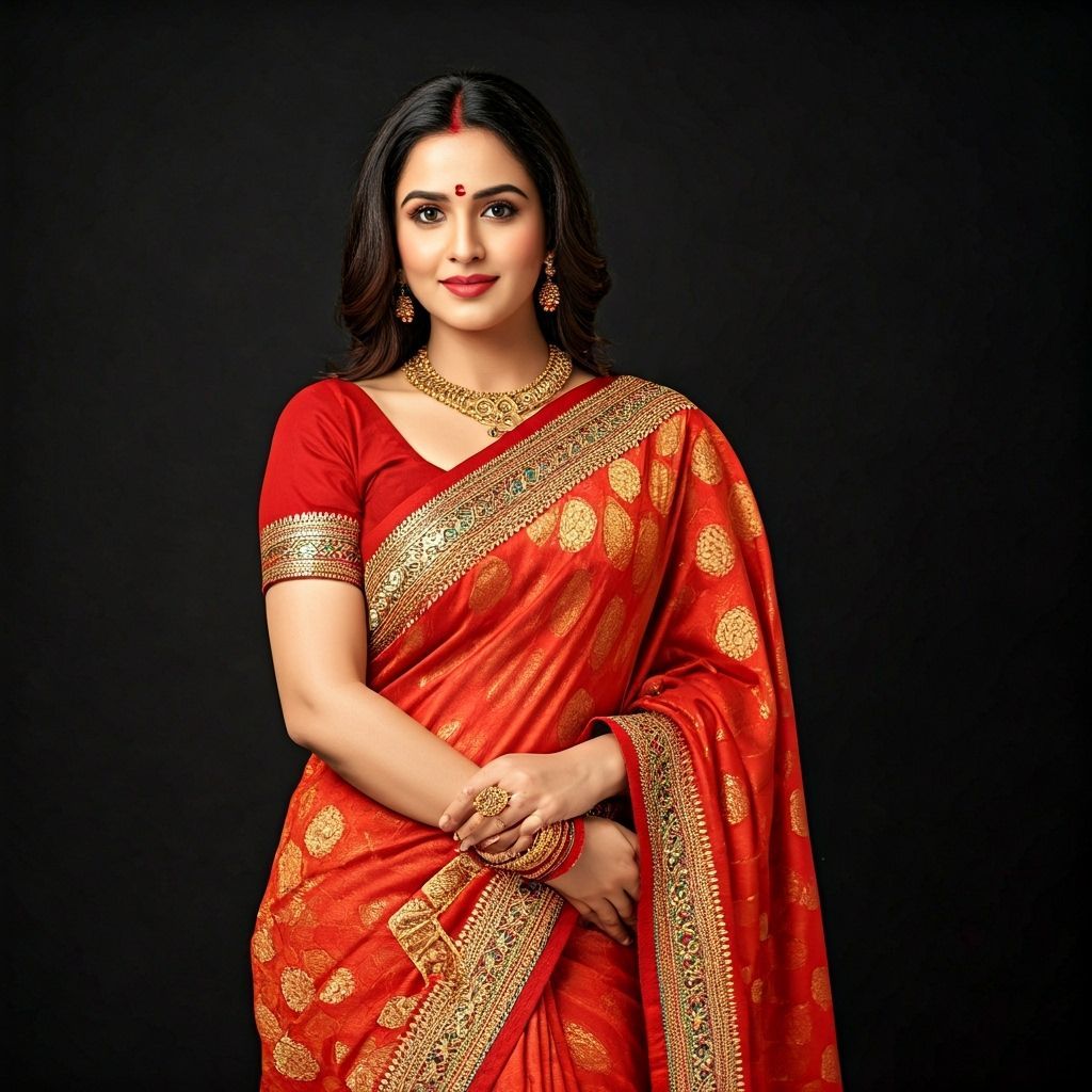 GAL GADOT WEARING MAHARASHTRA NAUVARI SAREE, IN WONDER WOMAN THEME COLOUR.