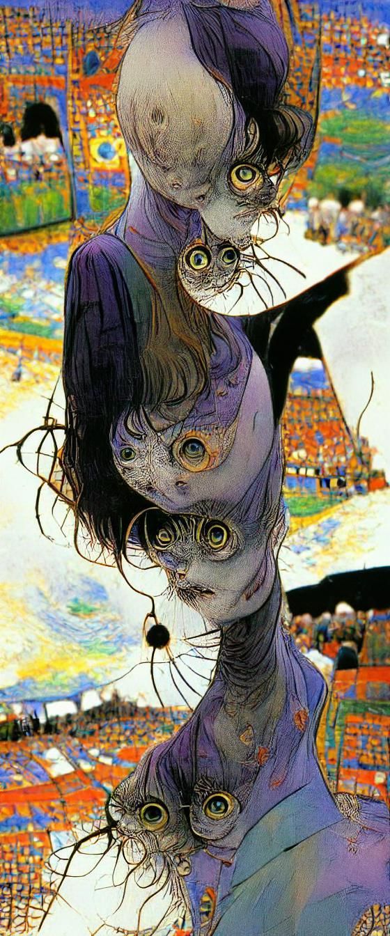 This image depicts a portrait of cats. The artwork evokes elements reminiscent of surrealist comics and impressionist paintings, with a focus on exaggerated features and atmospheric color.