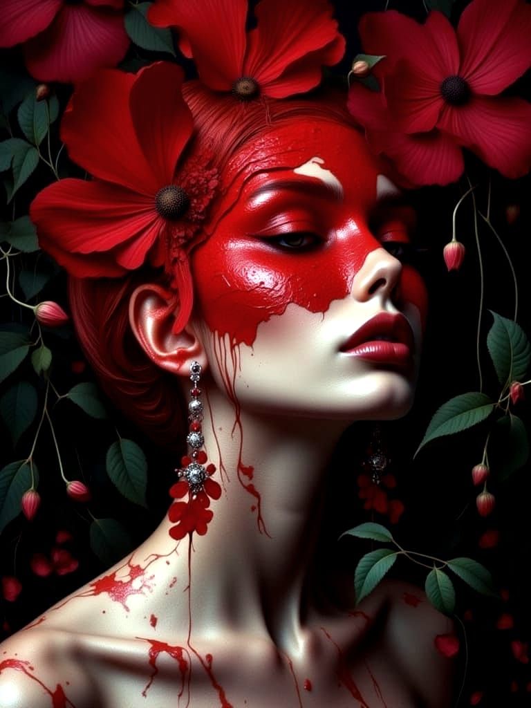 A vibrant digital collage featuring red flowers with art deco elements. The image showcases dynamic lighting, deep colors, and a blend of expressionism and retrofuturism in a surreal style.