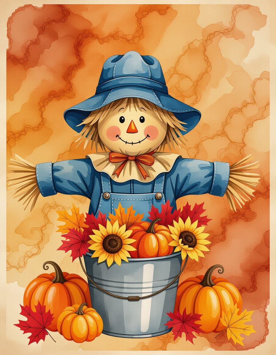 This image shows a vintage autumn scarecrow with a denim hat seated in a bucket, surrounded by fall decorations against a watercolor marbled backdrop. The artwork has a rustic farmhouse aesthetic.
