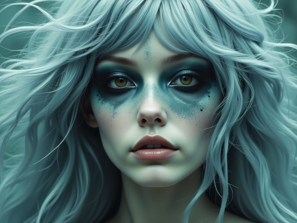 This image features a figure with perfect anatomy, showcasing detailed skin and hair texture. The color palette includes grey-blue, white, teal, and amber, creating an ethereal and intricate visual.