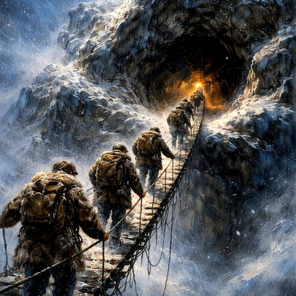 This image shows Arctic adventurers crossing a high rope bridge to an icy mountain cave, rendered in a textured oil painting style with dramatic cinematic lighting and heavy brushstrokes.