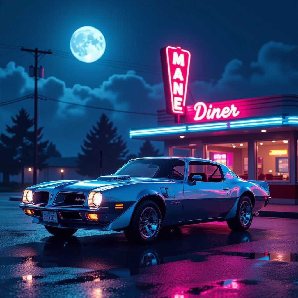 A striking picture of a classic 1970s Trans Am parked at a neon diner on a vibrant night. The image is styled with dynamic lines, bold colors, and a cinematic feel.
