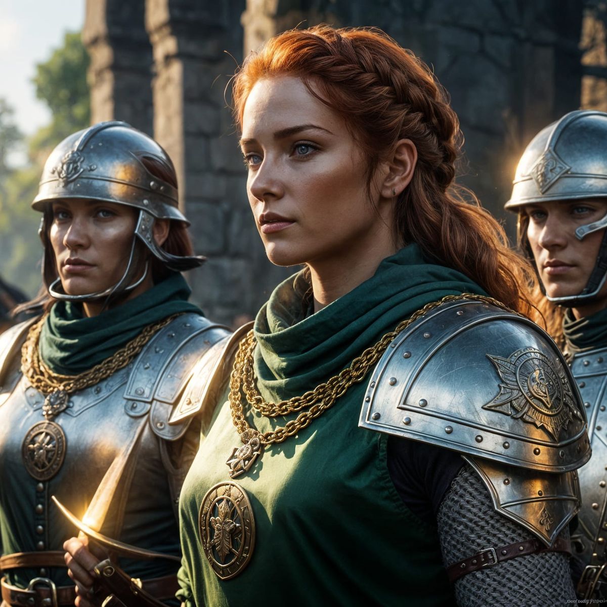 A striking image of a young woman in fantasy medieval attire, flanked by two armored knights bearing black hawk heraldry, set against a richly detailed background with deep colors and intricate textures.