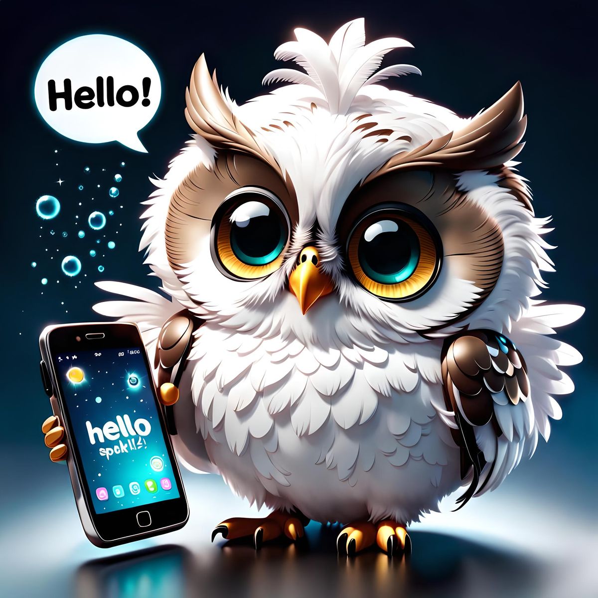This image shows a cute chibi owl character answering a ringing mobile phone. The cartoon design features sparkling eyes, fluffy white feathers, and a 'HELLO' chat bubble.
