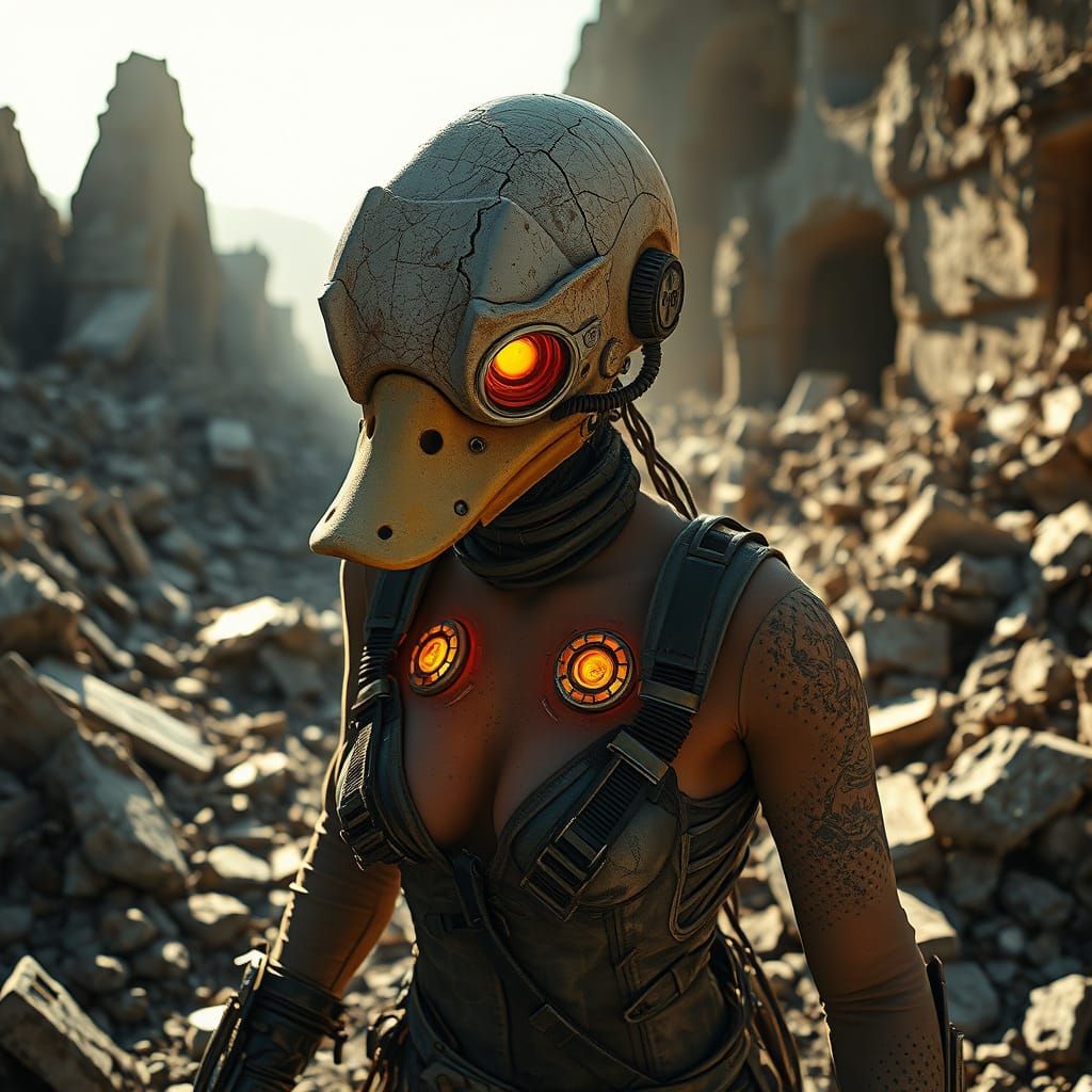 A striking picture of a woman wearing a cracked mask, her cybernetic organs exposed, navigating sun-scorched ruins. This image evokes a biomechanical aesthetic with screen-print textures in high contrast.