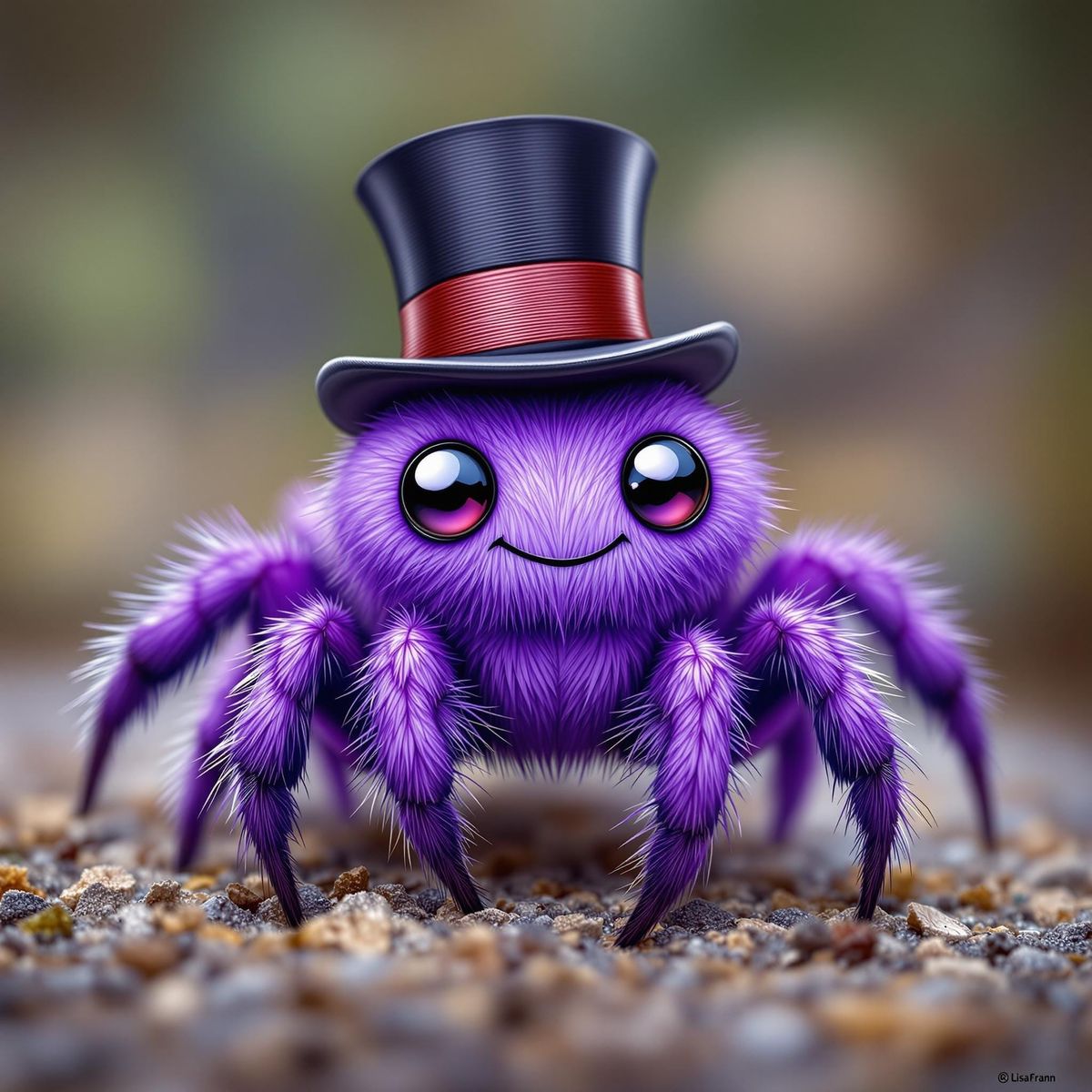 This image shows an adorable chibi-style purple jumping spider wearing a tiny top hat in a Lisa Frank-inspired aesthetic. The artwork is colorful and playful.