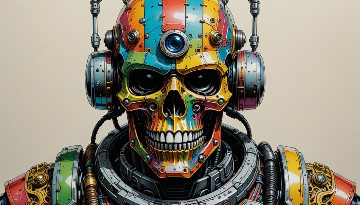 A futuristic robot skull, inspired by Moebius's surreal style, features a Roman Legionnaire design with bold, heavy inks and a kaleidoscope of rainbow colors