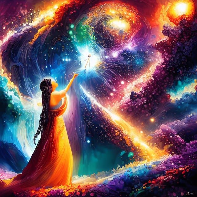 This image shows a woman dancing amidst swirling, vibrant colors. The scene evokes a sense of cosmic connection and romanticism, rendered in a dark and colorful aesthetic.