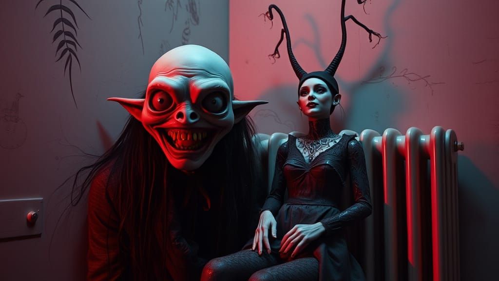 This image depicts a surreal scene where a feral, grinning doll meets a mysterious woman from the radiator in a dark, fantastical world with influences from H.R. Giger and Brothers Quay, set against a backdrop of imperial and split-complementary colors.