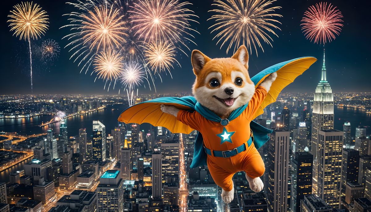 This image shows an anthropomorphic animal soaring above a brightly lit cityscape at night. Fireworks illuminate the sky as the figure, dressed in vibrant attire, celebrates with friends.