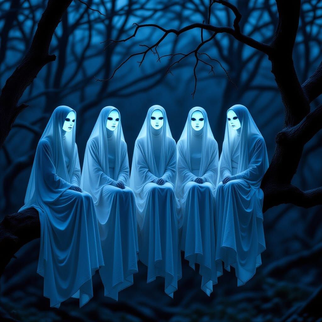 Group of six faceless ghostly women in long white gowns, perched on bare tree branches at night. Their pale blank masks glowing eerily under harsh flash, folds of fabric falling unnaturally, spectral silhouettes framed by dark forest. Cinematic horror-fantasy aesthetic with folkloric undertones, flash ...