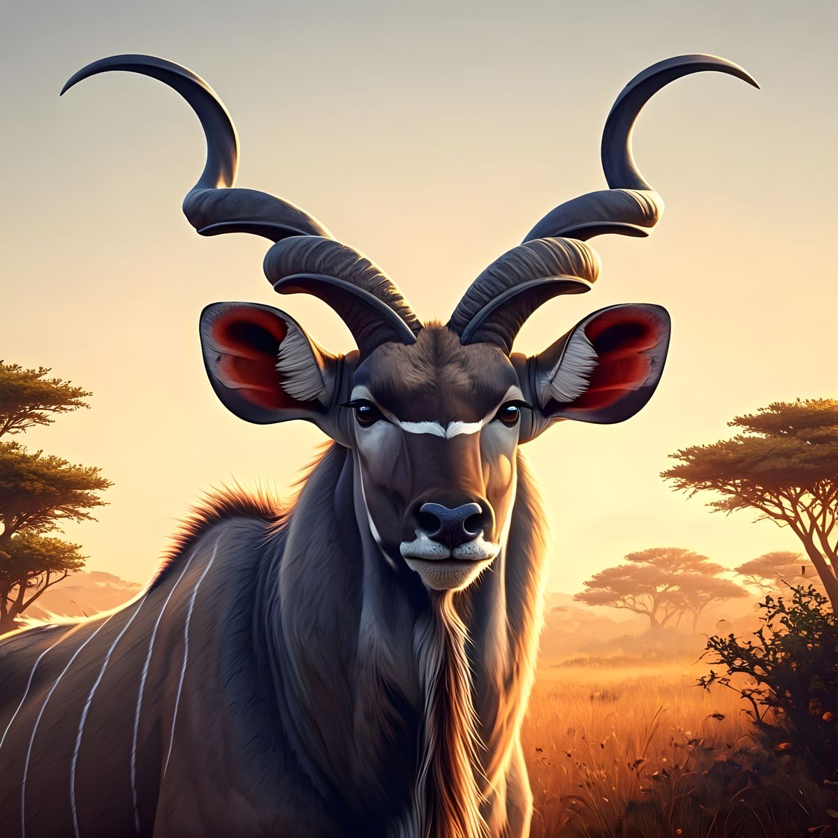 This image shows a striking double exposure of a kudu bull with other African animals. The artwork is 3D rendered digital art with extreme detail and aesthetic qualities.