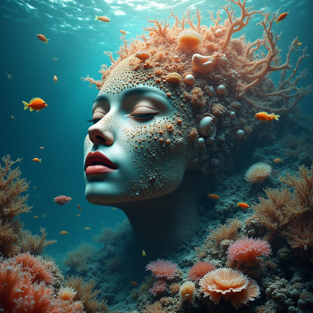 This image shows a vibrant underwater scene with intricate coral patterns resembling a woman's face, surrounded by delicate sea fans and colorful fish, all bathed in warm golden light.