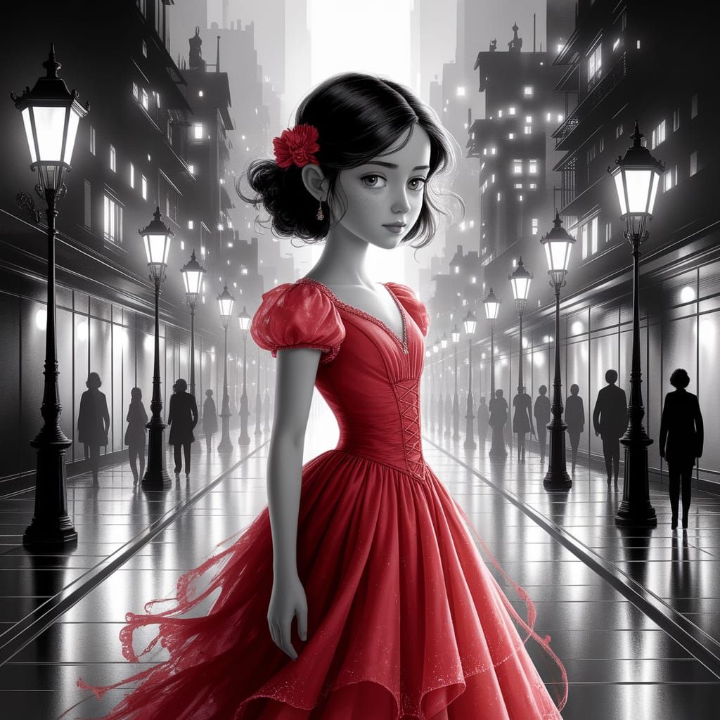 This image depicts a beautiful young woman in a vibrant red dress, illuminated by a warm glow against a blurred cityscape. Rendered in a semi-realistic, Pixar-inspired watercolor style with a refined touch.