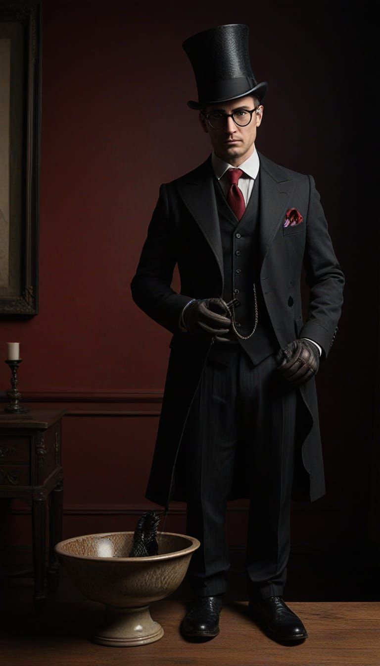 A hyperrealistic image shows a brunette in formal attire standing over an empty bowl with a raven. The scene features dramatic lighting, rich textures, and vibrant red details, as a cinematic film still.