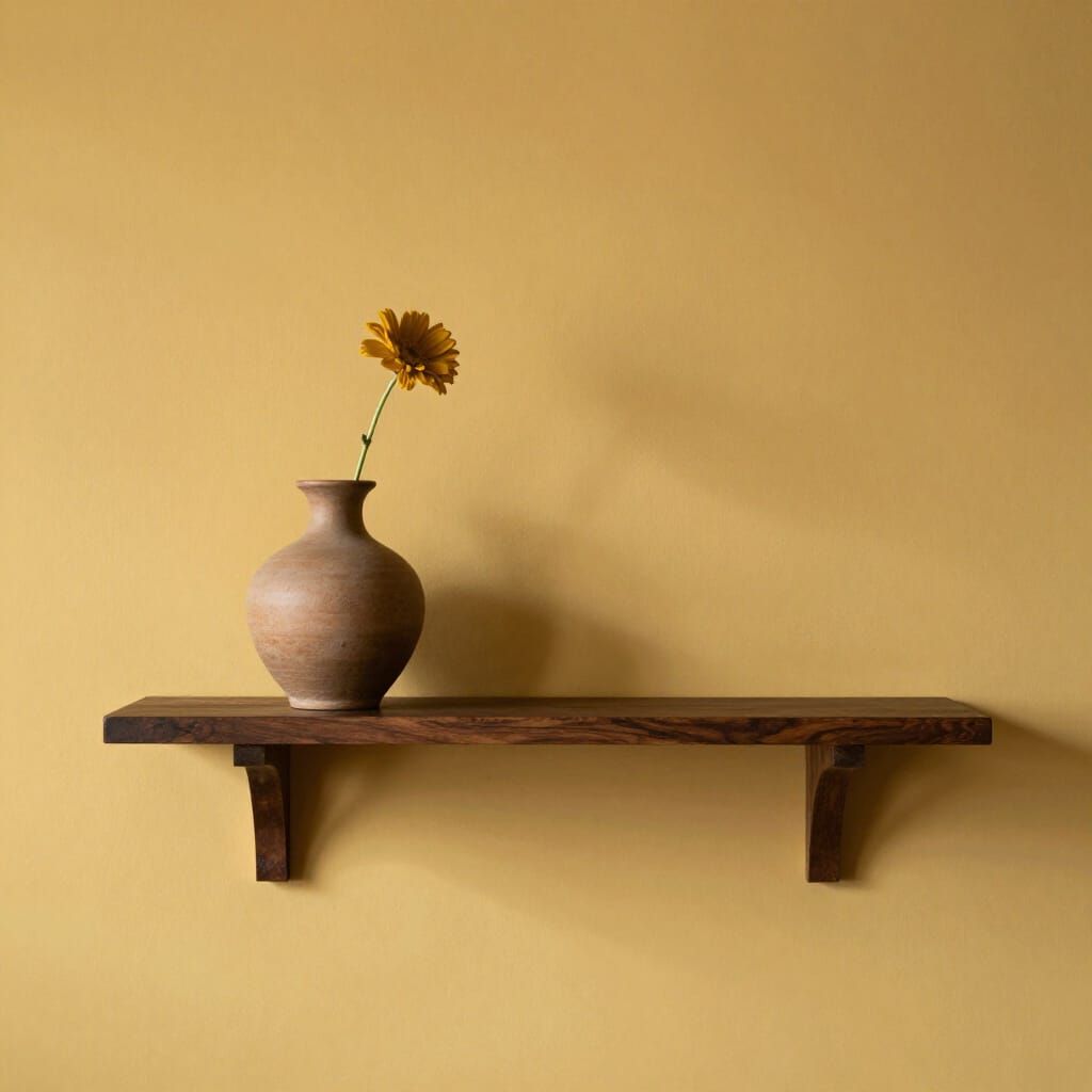 This photorealistic image features a single dark yellow flower in a clay vase on a dark wood shelf against a golden wall. Studio lighting creates soft shadows.