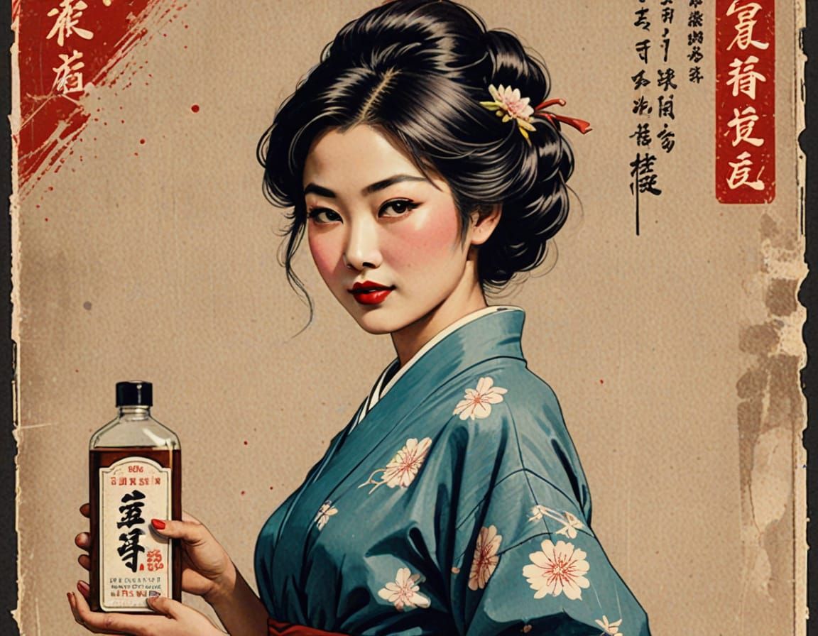 This image features a pin-up style Japanese woman in a sassy pose, selling hair lotion in a 1910s setting, with a backdrop of a pharma theme, rendered in a painterly and detailed style reminiscent of a grunge book cover.