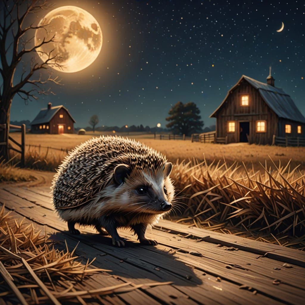 A heartwarming illustration of a hedgehog exploring a rustic barn at night. Golden moonlight illuminates the hay-strewn floor, creating a cozy, vintage atmosphere in this highly detailed rural landscape.