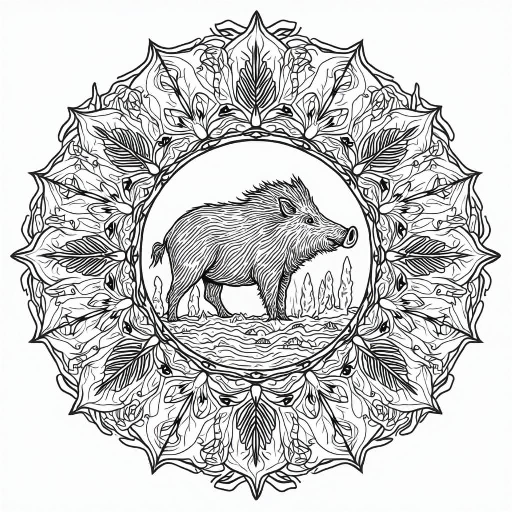 This striking black and white line art mandala features intricate patterns and a central wild boar silhouette, radiating from a balanced circular composition with crisp outlines and interlocking layers of natural elements.
