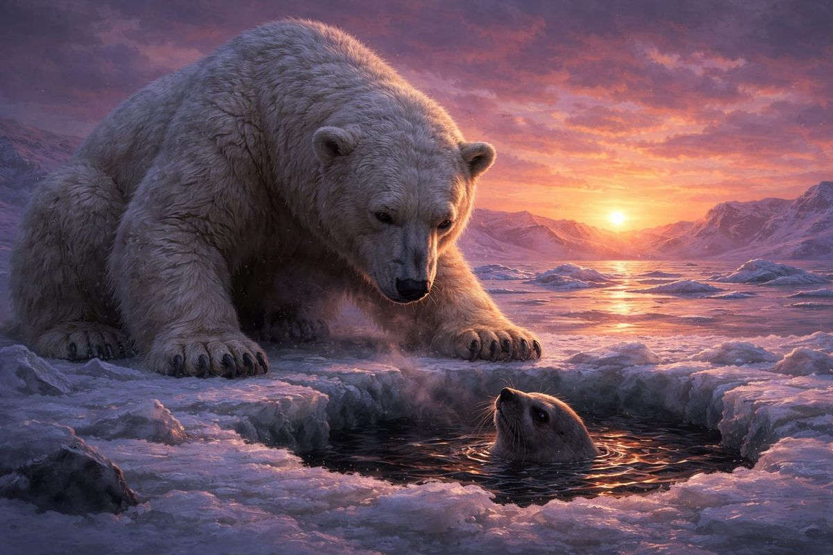 This image shows a dramatic painting of a massive polar bear patiently waiting for a seal to emerge from an icy hole at sunset. The scene captures a moment of survival in a frigid environment.