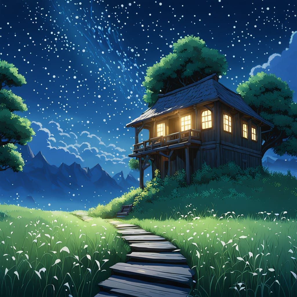 This serene image captures a mystical night sky with a warm cabin nestled under a towering tree, surrounded by soft clouds and delicate shooting stars, evoking a sense of wonder and enchantment reminiscent of Studio Ghibli's cinematic mastery.
