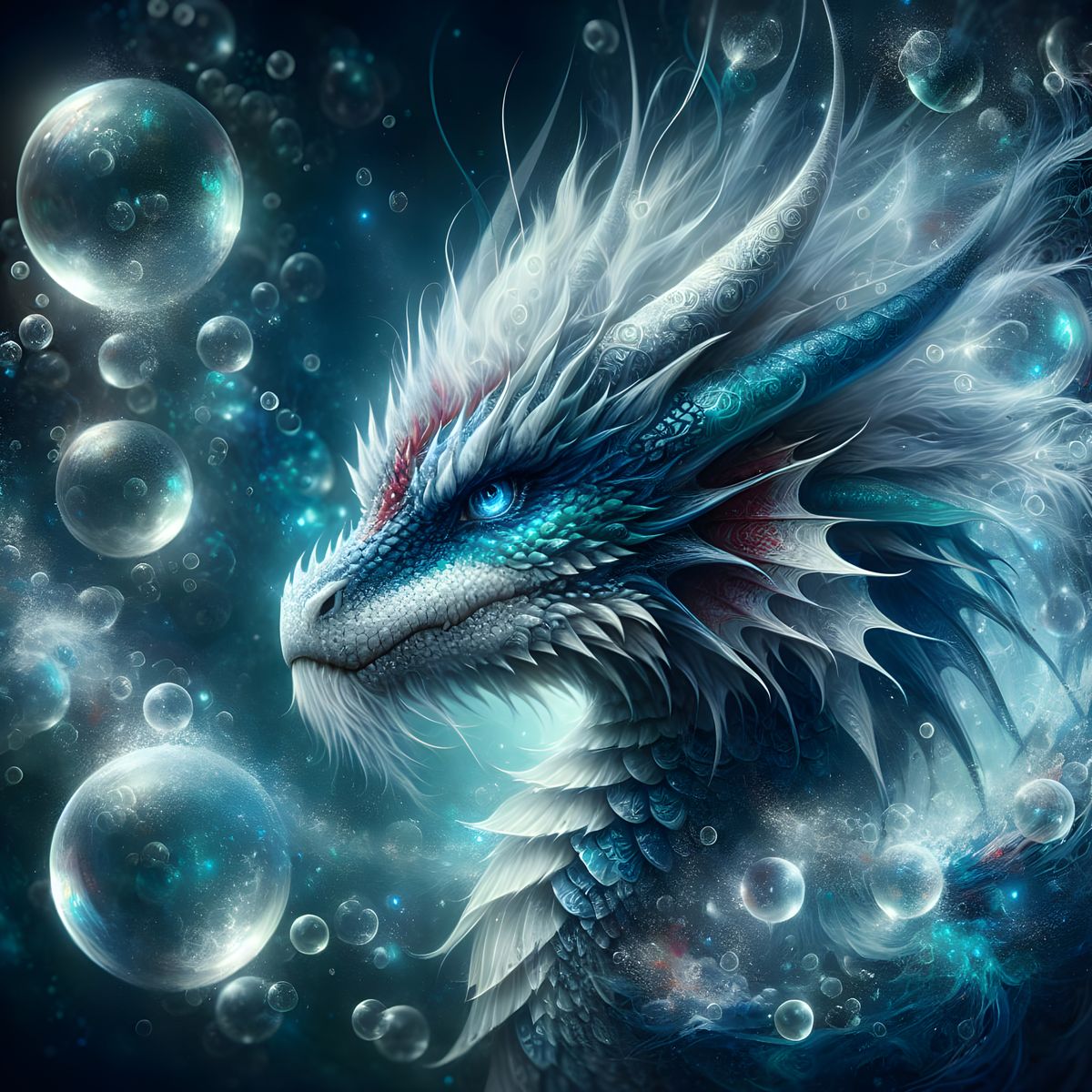 A striking picture of a majestic underwater dragon in a mystical setting. The dragon features detailed scales in shades of blue and white, with a vibrant crimson marking. Translucent bubbles enhance the magical ambiance as digital artwork.