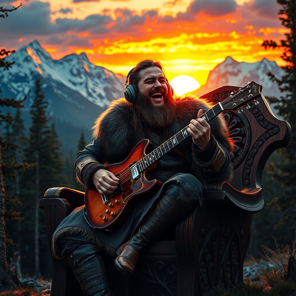 This image shows a young Viking king enjoying music while playing an electric guitar. The scene is set against a vibrant sunset and snowcapped mountains, reminiscent of a fantastical, cinematic painting.
