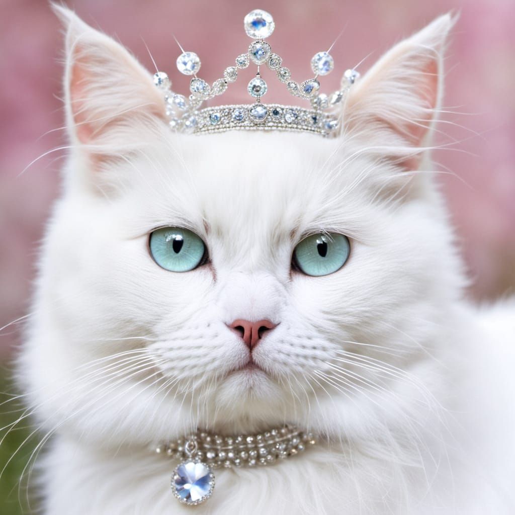 A close-up image shows a fluffy white cat adorned with a crystal collar and tiara. Soft focus and a pastel color palette enhance the fantasy aesthetic. Sparkling details capture the luxurious and cute nature of the subject.