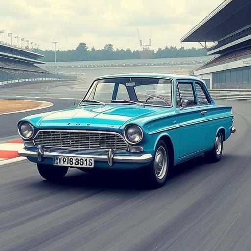 A vibrant manga-style illustration of a classic 1962 Ford Cortina Mk1 in sky blue. The close-up macro shot showcases the glossy car body with sunshine reflections and bright, colorful tones.