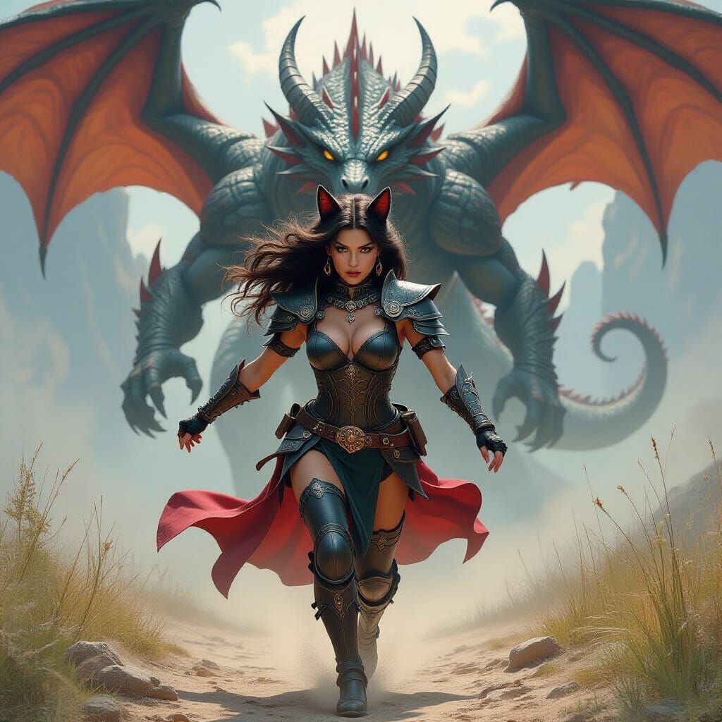 A vivid oil painting of a cat-eared woman in leather armor running forward. A huge dragon rises from the mist behind her. The artwork features dramatic lighting.