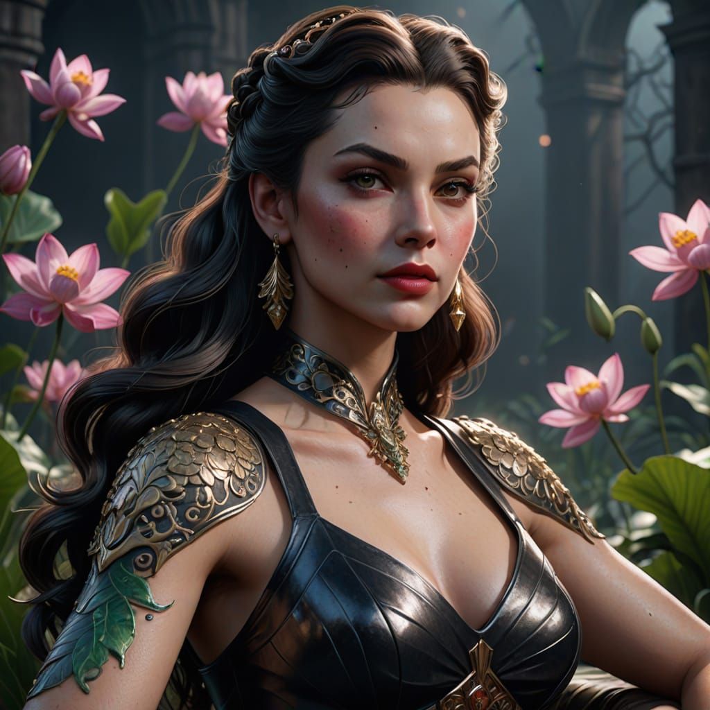 A striking picture of Scarlett O'Hara, age 30, in a high-fashion editorial style. The hyperrealistic image features radiant skin, latex strips, and dynamic lotus and orchid flowers, rendered as a detailed matte painting.